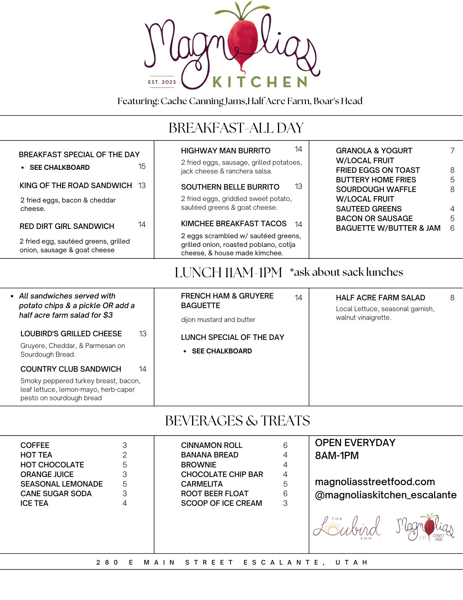 Brand new Traditional-American casual restaurant for breakfast and lunch on Highway 12 in Escalante, Utah. Dining inside and outside plus live music on the outdoor patio often. Takeout available.
